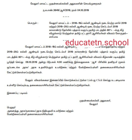பத்தாம் வகுப்பு காலாண்டு தேர்வில் 80%க்கு கீழ் பெற்றுள்ள தமிழ் ஆசிரியர்கள் விவரம் கோரி செயல்முறைகள் Posted bySha EDUCATEOctober 9, 2019October 9, 2019Posted inகல்வி செய்தி Click here join telegram group link Share this: Share on WhatsApp (Opens in new window) WhatsApp Share on Telegram (Opens in new window) Telegram Email a link to a friend (Opens in new window) Email Like Loading... Related