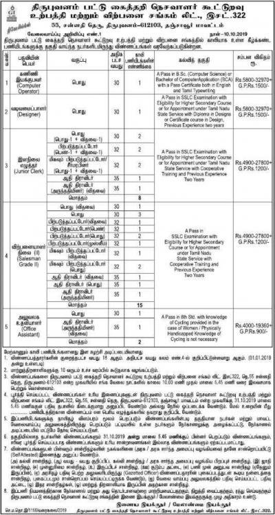 தமிழக அரசின்கீழ் செயல்பட்டு வரும் திருபுவனம் பட்டு கைத்தறி நெசவாளர் கூட்டுறவு உற்பத்தி மற்றும் விற்பனை சங்கத்தில் காலியாக உள்ள 27 கணினி இயக்குனர், வடிவமைப்பாளர், இளநிலை எழுத்தர், விற்பனையாளர் போன்ற பணியிடங்களுக்கான அறிவிப்பு வெளியிடப்பட்டுள்ளது. இதற்குத் தகுதியும், விருப்பமும் உள்ளவர்களிடம் இருந்து விண்ணப்பங்கள் வரவேற்கப்படுகின்றன.
