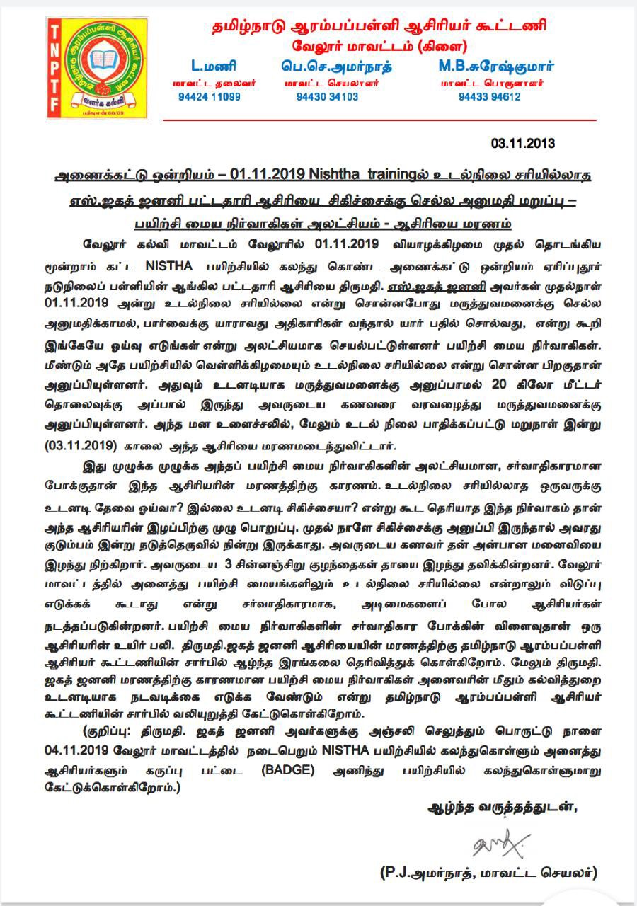 Nishtha Training – ஆசிரியை மரணம்? – நல்லடக்கம் இன்று நடைபெறும் Posted bySha EDUCATENovember 4, 2019November 4, 2019Posted inகல்வி செய்தி Share this: Share on WhatsApp (Opens in new window) WhatsApp Share on Telegram (Opens in new window) Telegram Email a link to a friend (Opens in new window) Email Like Loading... Related